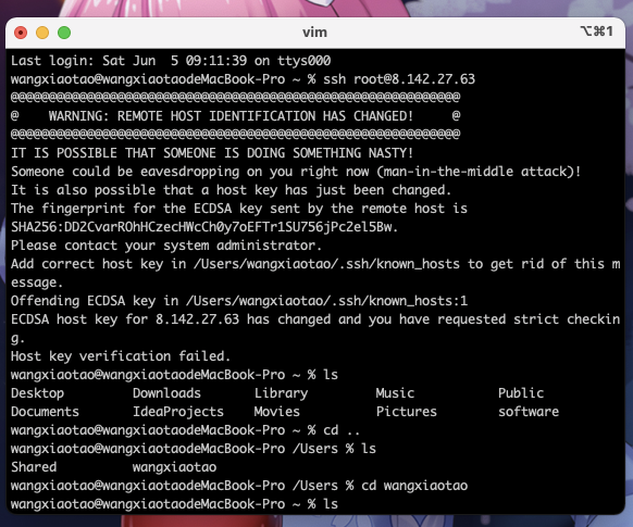- 删除本地验证信息,看图我们可以知道验证信息就是/Users/wangxiaotao/.ssh/known_hosts 的known_hosts文件;执行命令 rm -rf ./known_hosts将验证信息删除,或者将远程服务器对应的配置信息删除;